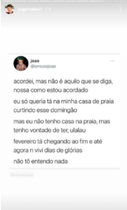Posteriormente, Yago postou um meme com relação a um desejo dele. “Acordei, mas não é aquilo que se diga, nossa como estou acordado. Eu só queria tá na minha casa de praia curtindo esse domingão. Mas, eu não tenho casa de praia, mas tenho vontade de ter. Fevereiro tá chegando ao fim e até agora não vivi dias de glória. Não estou entendendo nada”.