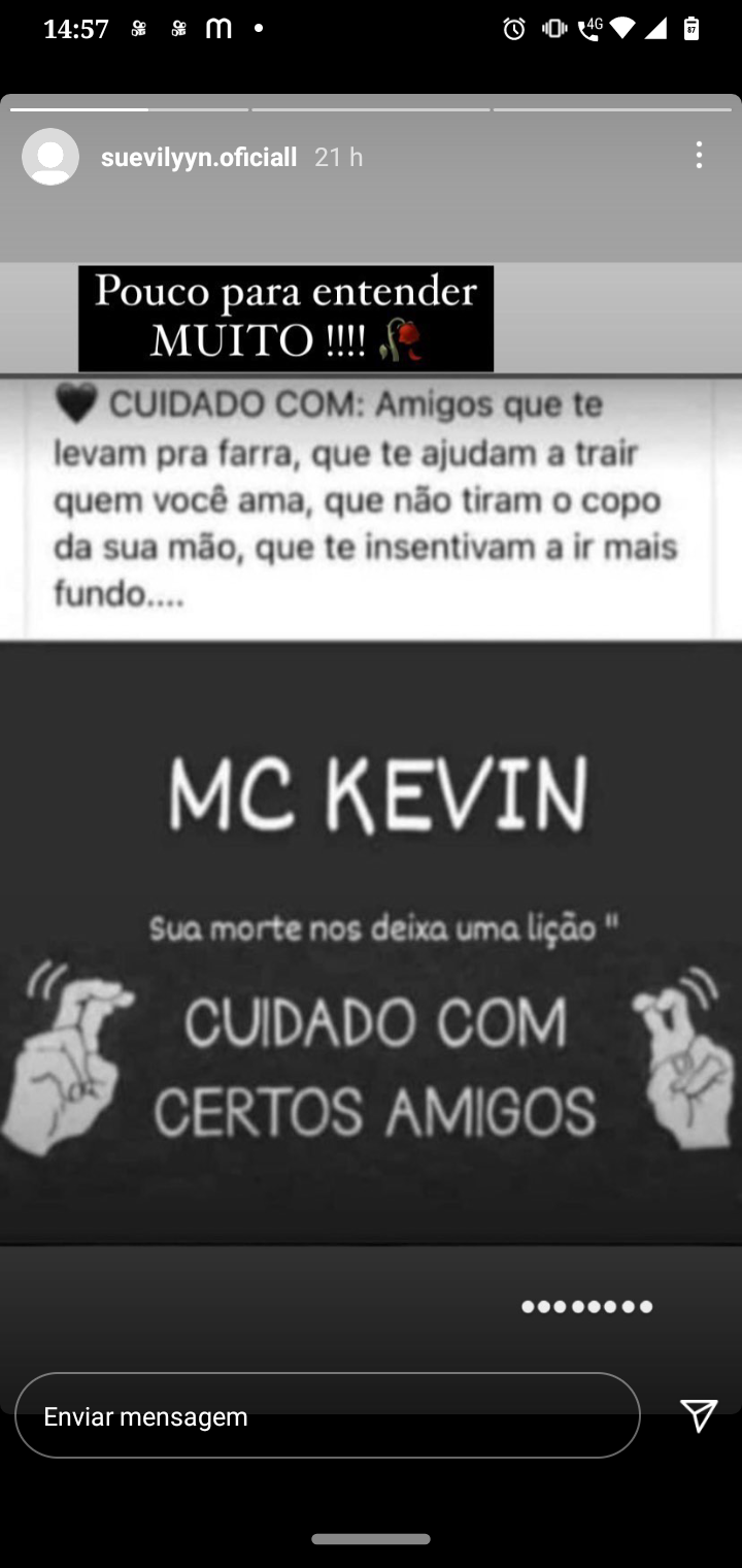 Sobretudo, segundo Evilim, a morte de Kevin deixa uma lição. “Cuidado com: amigos que te levam pra farra, que te ajudam a atrair quem você ama, que não tiram o copo da sua mão, que te incentivam a ir mais fundo”, postou a moça através dos stories do Instagram.