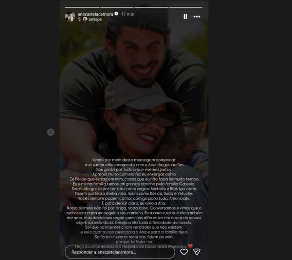 Na noite de 29 de dezembro de 2025, os cantores Ana Castela e Zé Felipe surpreenderam fãs ao anunciar o término do relacionamento. A notícia foi divulgada por meio dos stories do Instagram de Zé Felipe e rapidamente compartilhada por Ana Castela, confirmando oficialmente o fim do namoro.