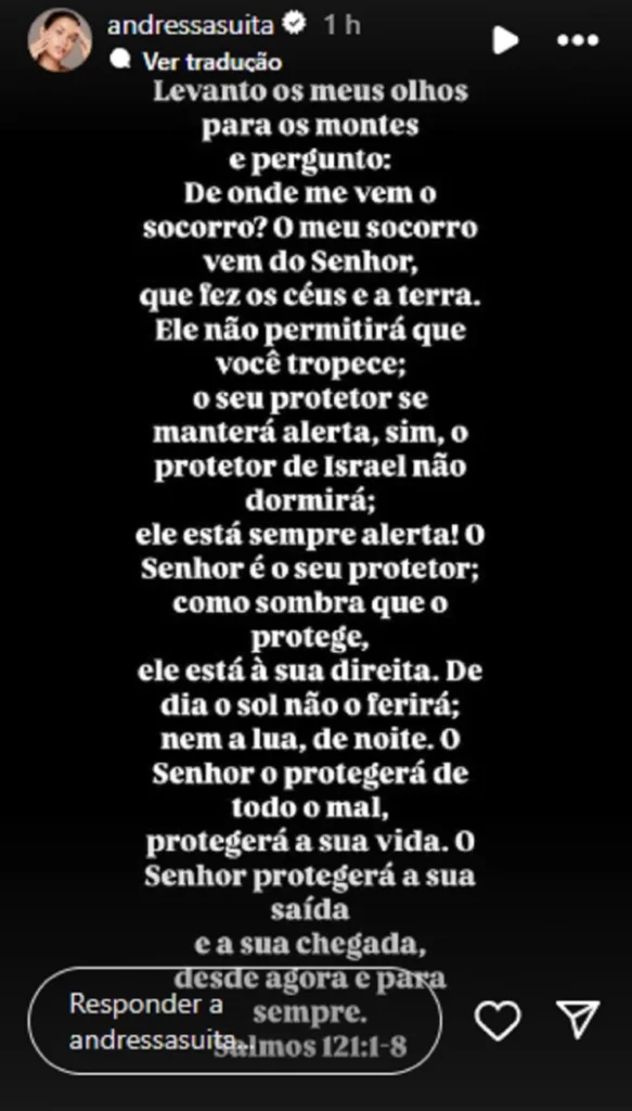 A esposa de Gusttavo Lima, Andressa Suita, usou seu perfil no Instagram para se manifestar após a prisão do marido. Ela compartilhou o Salmo 121, buscando consolo espiritual em meio à polêmica.