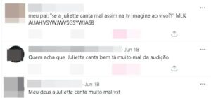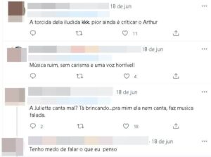 “Pra quem falou do Arthur, a Juliette canta péssimo, gente, pelo amor de Deus“, comentou uma internauta, logo outros começaram a relembrar as críticas da paraibana ao ator, e não perdoaram ela.