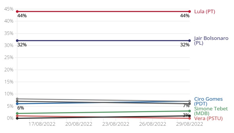 Ambos dos candidatos aparece com os mesmos índices de 15 de agosto, onde foi feito o último levantamento do Ipec para presidente da república, onde aparece uma cena estável na disputa.