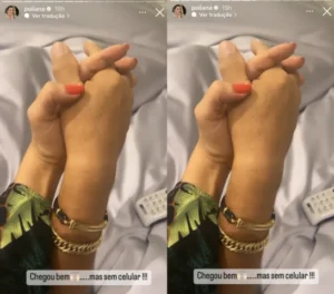“Chegou bem… mas sem celular!”, disse Poliana, dando a entender que o momento era só dos dois.