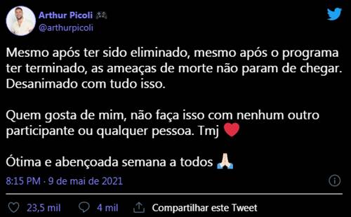 “Mesmo após ter sido eliminado, mesmo após o programa ter terminado, as ameaças de morte não param de chegar. Desanimado com tudo isso. Quem gosta de mim, não faça isso com nenhum outro participante ou qualquer pessoa”, desejou ele.