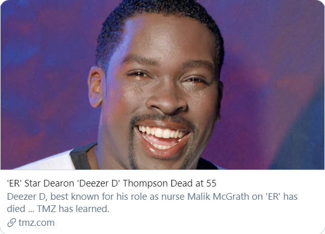 Dearon Thompson seria ele, que começou a ser conhecido por seu nome artístico que é Deezer D. Ele chegou na fama por conta de seu grande trabalho sendo o enfermeiro Malik McGrath em uma série chamada Plantão Médico, de 94. Tudo foi informado sobre seu falecimento nesta ultima 5º feira, dia 7 deste mês de janeiro.