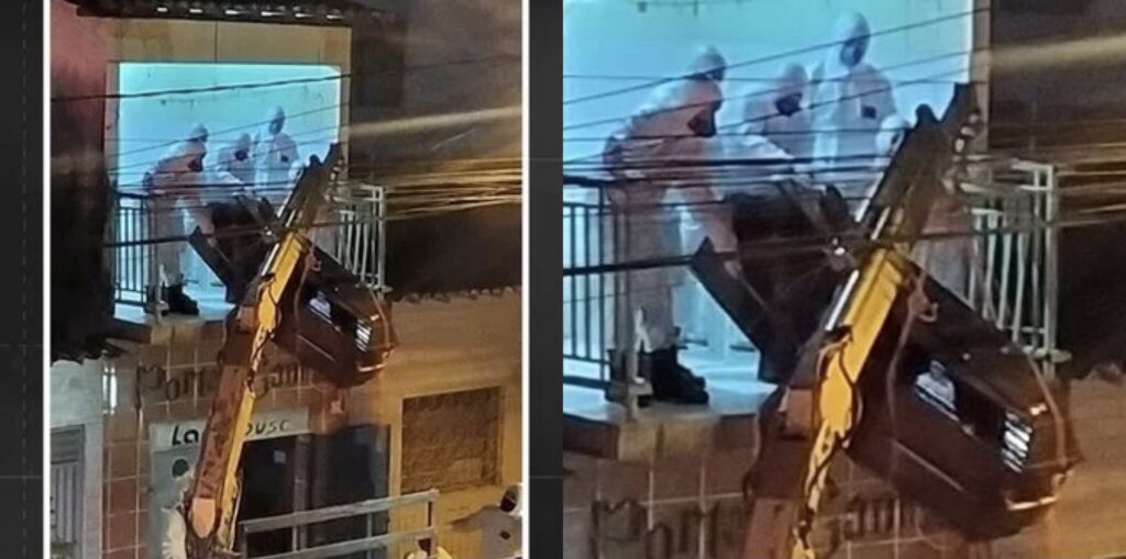 Caixão de vítima da covid é retirado pela varada de apartamento, amarrando em um caminhão-quincho; cenas são comoventes