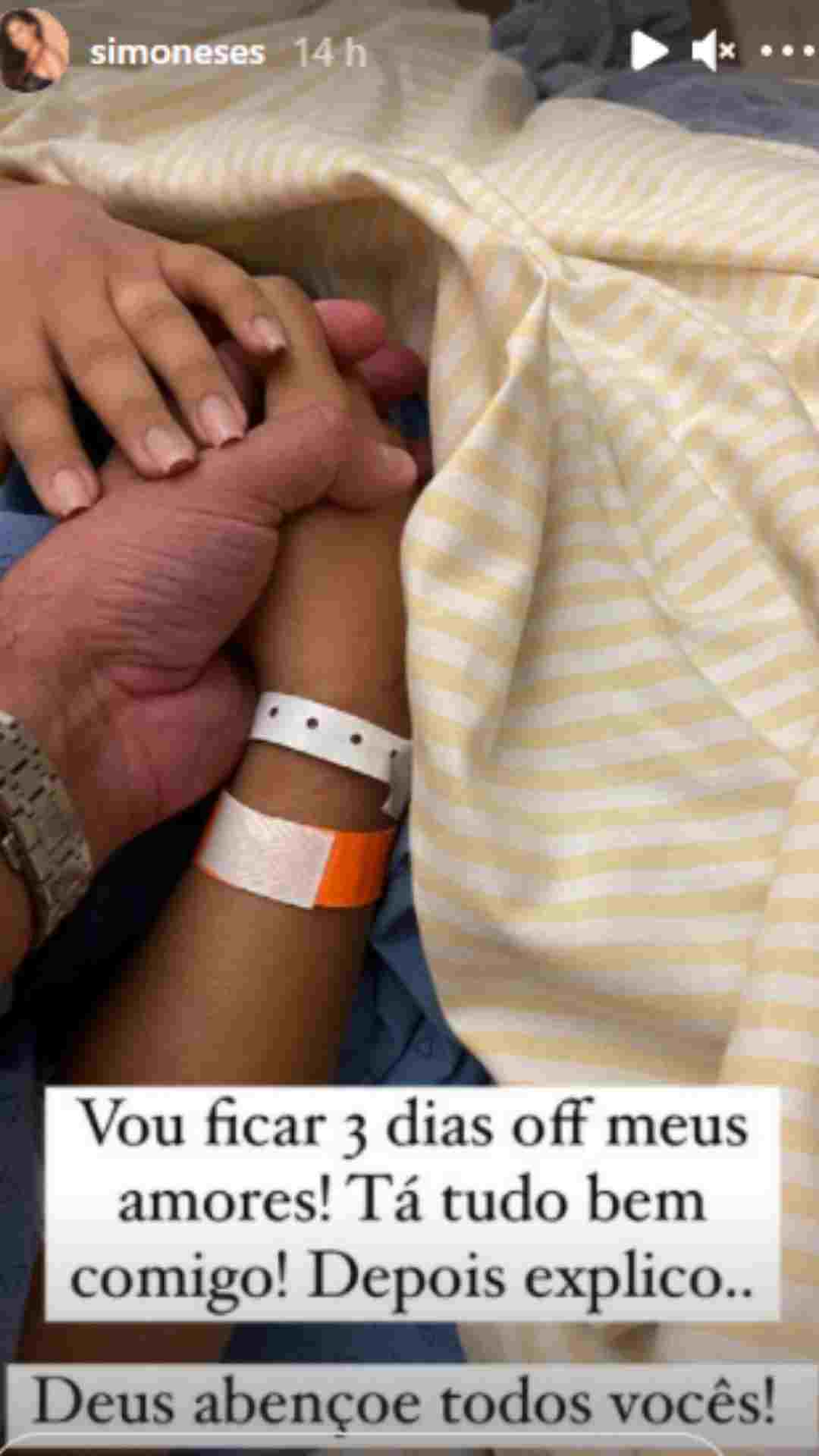 Entretanto, nesta sexta-feira, 28, Simone publicou uma foto na cama do hospital e deixou os fãs preocupados. Mais tarde, seu marido, Kaká Diniz, explicou o motivo da internação e repassou que a cantora estava bem, portanto precisando descansar. A assessoria de imprensa da cantora também se pronunciou e revelou o quadro de saúde.