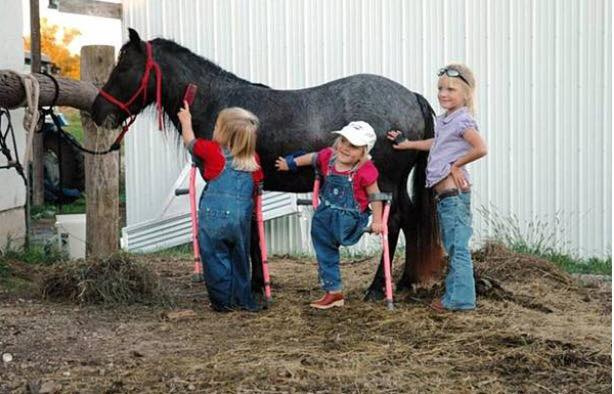 Nesta outra foto, aparece as três irmãs brincando com um animal – que aparentemente é um quadrupede – elas também parecem estar felizes.