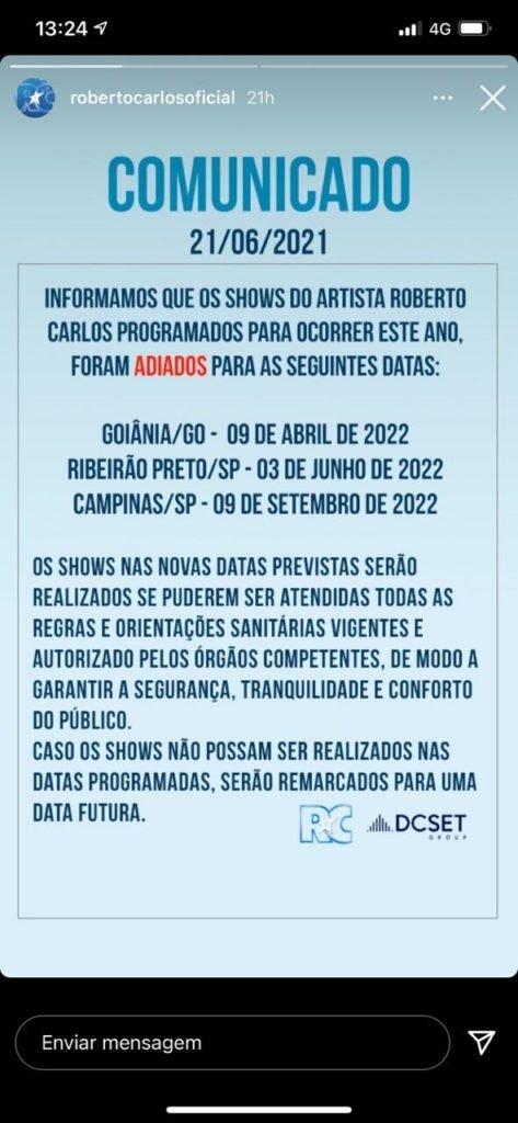 Entretanto, para acalmar o coração daqueles que admiram o Rei, novas datas para os shows já foram confirmadas. Como não se sabe como estará a pandemia até 2022, a produção de Roberto Carlos esclareceu que se as coisas ainda estiverem difíceis, os shows serão realizados quando for seguro.