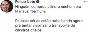 Felipe Neto critica famosos por estarem mobilizando a compra de cilindros de oxigênio.