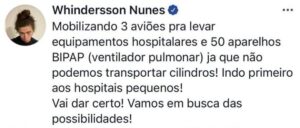 Então, como forma de mais uma ajuda, Whindersson Nunes acabou de fazer mais uma publicação falando que está mobilizando mais 3 aviões para fazer o transporte de equipamentos hospitalar e mais 50 ventiladores pulmonar.