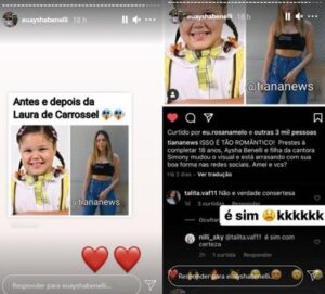Filha da cantora Simony, Aysha Benelli, deixou os fãs de boca aberta ao compartilhar em suas redes sociais a foto de uma antes e depois com 35kg a menos. A jovem que fez sucesso na novela de Carrossel fazendo intérprete da personagem Laura e ficou conhecida após sua fala constante na novela: “isso é tão romântico!”.