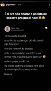 “Boa noite Brasil, o sonho de toda sogra está indo dormir já já, fala baixo. Não estou on, nem off, estou exausto. O TBT que eu queria fez um inferno na minha vida, mas eu queria de novo. Evite golpe e vá dormir. Na minha cartinha de papai noel este ano eu vou pedir socorro”, dizia o meme publicado recentemente.