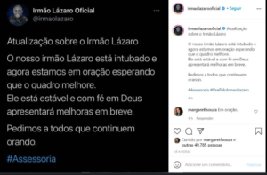 “Com muita fé em Deus e contando com as orações de todos vocês, logo veremos o nosso Irmão Lázaro bem novamente”, escreveu a assessoria nas redes sociais.