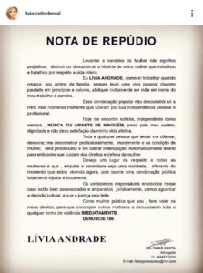 Lívia então, tomou uma atitude drástica, e foi a justiça, logo em seguida mandou uma nota de repúdio para a influencer, que ainda não se pronunciou sobre o ocorrido, veja;