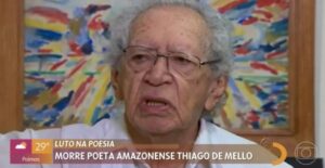 “Mudando de assunto, infelizmente vou ter que dar essa notícia. Agora são 11h57 no horário de Brasília. A gente recebeu a triste notícia de que morreu, agora de manhã, aos 95 anos, o poeta amazonense Thiago de Mello. Ele morreu em casa, em Manaus. A causa da morte ainda não foi informada”, disse a jornalista.