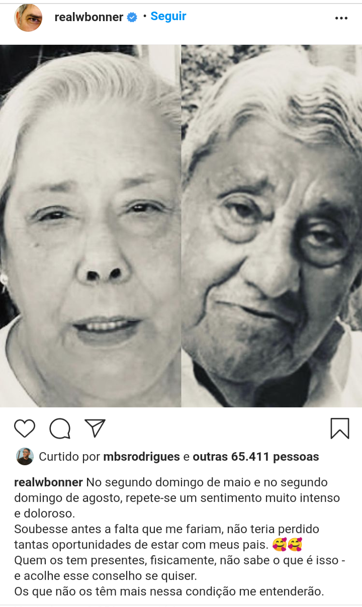 “No segundo domingo de maio e no segundo domingo de agosto, repete-se um sentimento muito intenso e doloroso”, escreveu o âncora, de 57 anos. Ele admitiu um remorso. “Se soubesse antes a falta que me fariam, não teria perdido tantas oportunidades de estar com meus pais.”