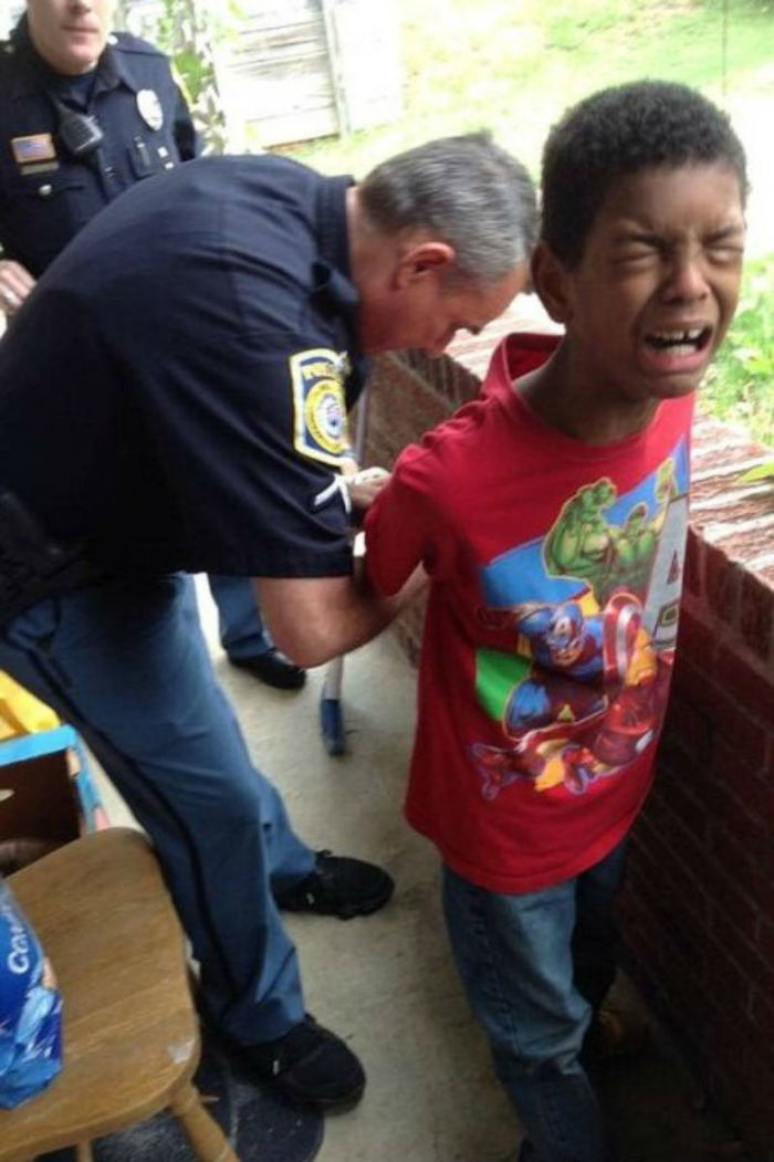 A mulher entrou em contato com a polícia local e solicitou a presença de dois oficiais para simular a prisão do garoto.