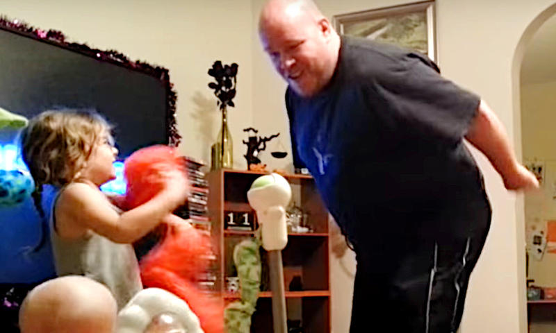 Eles brincam de tudo. E o pai começa a dançar e fazer outras coisas com a menina. Ela ama! Quem não gosta de brincar né? Portanto, foi essa a brincadeira que ocorreu entre ambos. E eles ficaram bem felizes juntos. E a mãe, mesmo com vergonha – da atitude do pai – amou, o momento de união entre eles.