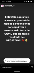 Contudo, através das redes sociais, a mãe da influenciadora postou uma sequência de stories e alegou receber o prontuário com o resultado do teste, no qual deu negativo. Além do teste da Covid-19, a família descobriu que Ygona veio a óbito por causa de um choque séptico de foco pulmonar, em decorrência de uma Tuberculose.