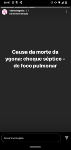 “Que a justiça seja feita. Enfim! Só agora tive acesso ao prontuário médico da Ygona, onde consegui ver o resultado do teste de Covid que ela fez e o resultado deu negativo. Causa da morte: choque séptico de foco pulmonar. E tem mais… Ygona testou positivo para tuberculose”, disse.