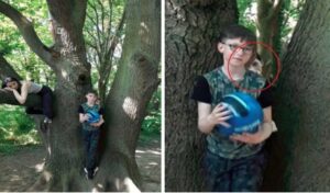 Então a mãe decidiu de tirar uma fotografia de seu filho em uma árvore, más acabou tendo um grande susto, após ver uma mulher de aparência assustadora atrás de seu filho, com a mão em seu ombro, confira;