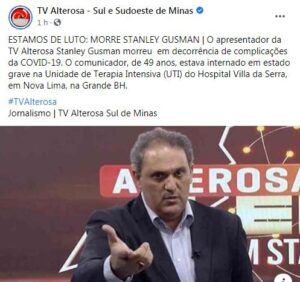 “Estamos de luto. O apresentador da TV Alterosa Stanley Gusman morreu em decorrência de complicações da COVID-19.