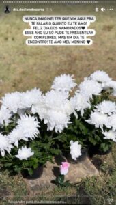 “Nunca imaginei ter que vir aqui para falar o quanto eu te amo. Feliz Dia dos Namorados, esse ano só pude te presentear com flores, mas um dia te encontro. Te amo, meu menino”, escreveu.