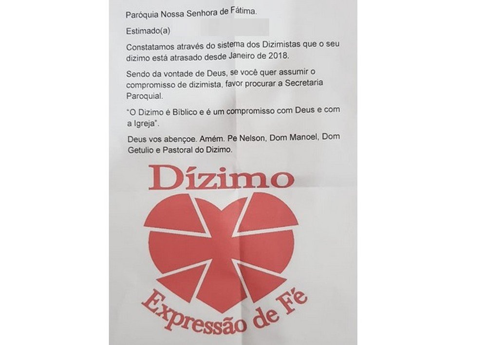 A paróquia do Norte do Paraná ‘Nossa Senhora de Fátima’ manda carta de cobrança do dízimo pelos correios e revolta fiéis. A paróquia envia cartas aos fies para alertá-los de que o pagamento do dízimo estava em atraso. Na carta consta a assinatura do Padre Nelson Mendes, Dom Getúlio, Dom Manoel e também pela pastoral que cuida do dízimo.