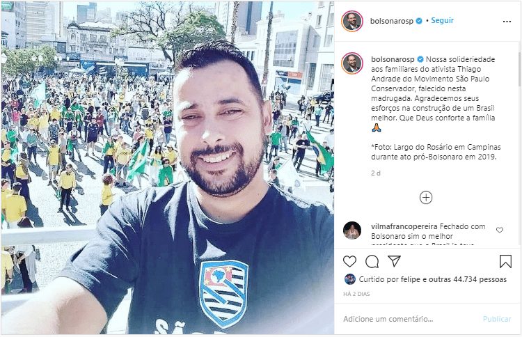 No último domingo, no estado de São Paulo, veio a óbito o pastor Thiago Andrade, de 36 anos, ele foi vítima da Covid-19. Ele era um ativista prol Bolsonaro e integrava o movimento São Paulo Conservador, além que ele por diversas vezes usou suas redes sociais para defender o uso de cloroquina e ivermectina como saídas ao combate da Covid-19, tais ações o tornou bastante conhecido.