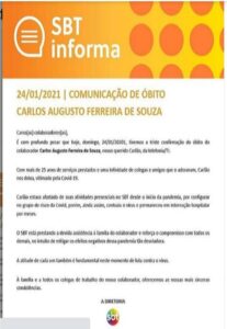 Por seguinte, a nota confirma a morte do coordenador de telefonia, Carlos Augusto Ferreira de Souza, conhecido intimamente dentro dos camarins como Carlão. Um Funcionário no qual rendeu muito elogios pelo excelente trabalho, atuou no SBT por aproximadamente 25 anos.