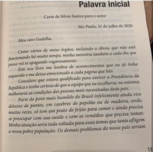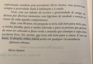 “Como muitos de meus órgãos, incluindo o óbvio, que não funciona há muito tempo, minha memória a cada dia que passa vai se apagando vagarosamente. Este seu livro me lembra de acontecimentos que eu já tinha esquecido e me deixa emocionado a cada página que leio”, diz Silvio Santos, em um dos trechos da obra.