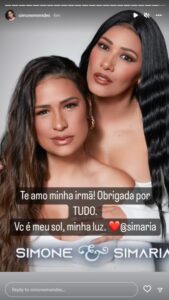 Os fãs de Simone e Simaria estão desolados, com o anúncio do fim da dupla, feito na noite de ontem. Logo após Simone fez uma declaração a sua irmã, através dos storys de seu Instagram e emocionou a todos.