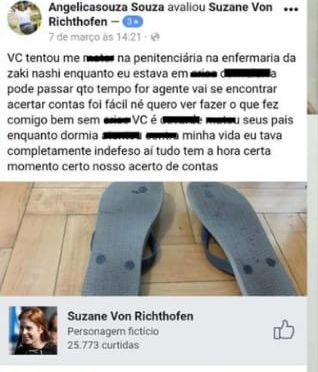 Recentemente, uma mulher identificada como Angelica Souza postou na página do facebook de Suzane Von Ritcthofen a acusando de ter tentado lhe matar.