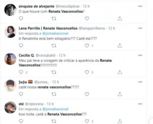 “Re, tá tudo bem? Sentimos sua falta hoje. Tranquiliza a gente”, escreveu outra internauta. Até o fechamento desta reportagem, Renata não havia dado nenhuma resposta sobre o porquê não apresentou o Jornal Nacional.