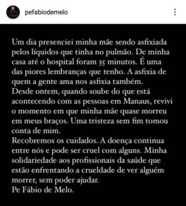 “Desde ontem quando soube do que está ocorrendo com as pessoas em Manaus, revivi um instante em que quase minha mãe nos deixou em meus braços”, ressaltou Fábio de Melo.